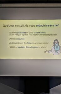 Mardi 25 novembre, la classe de 4e3 s’est rendue à la médiathèque du Tonkin à Villeurbanne pour découvrir le métier de journaliste. A travers un jeu collaboratif: “36h à la rédac” les élèves se sont glissés dans la peau de reporters pour couvrir une information de premier ordre. Ils ont dû choisir leurs sources, déjouer les fausses informations, éviter les rumeurs et rencontrer des témoins fiables pour que leur article soit publié et fasse évidemment la une de leur journal!