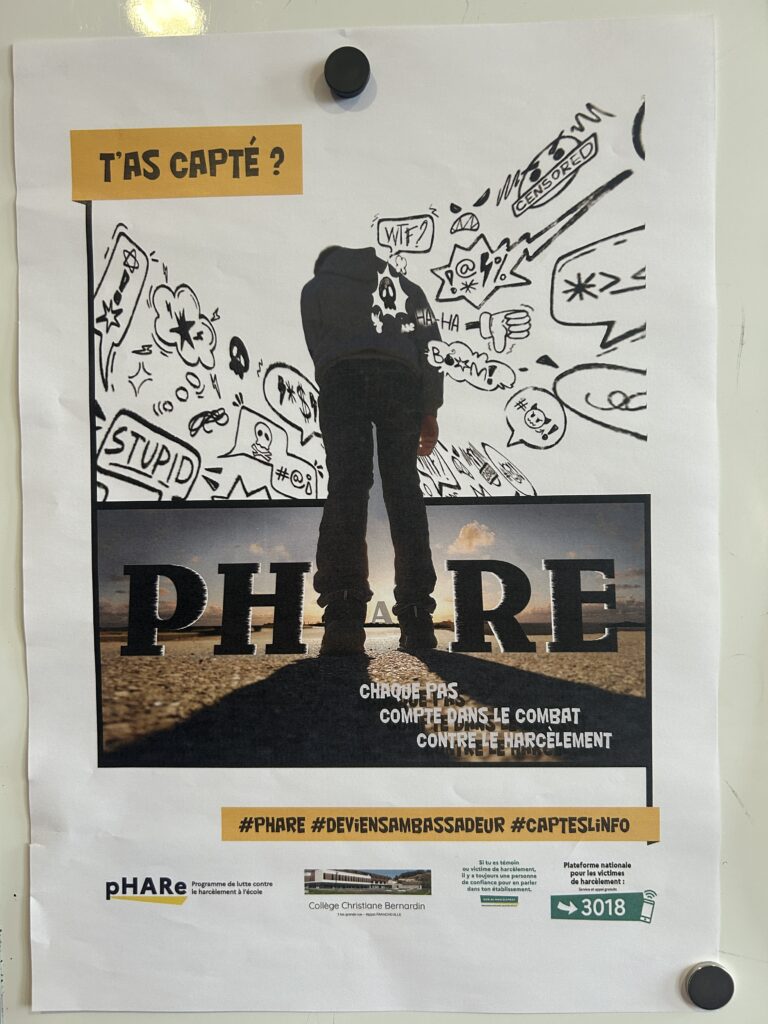 Nous avons fini de réfléchir à l’affiche qui représentera notre collège au concours “Non au harcèlement 2026” (grâce à l’aide précieuse de Gwenaël, AED qui a une solide formation en Arts appliqués) puis nous avons échangé autour du rôle de témoin suiveur et de celui de témoin positif et empathique… Ce fût un beau moment de partage et d’échanges!