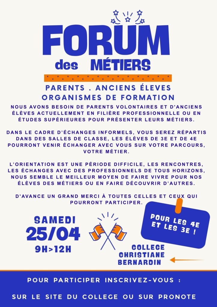 FORUM DES MÉTIERS – 25 AVRIL 2026 Publié le 26 mars 202626 mars 2026 par LE-SCANFF Anne LIEN A CLIQUER POUR PARTICIPER AU FORUM DES MÉTIERS